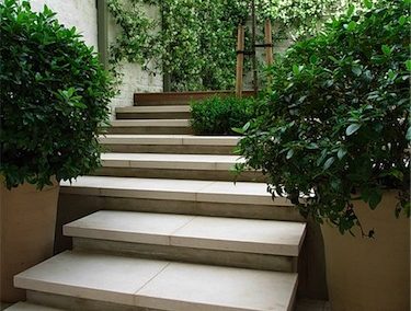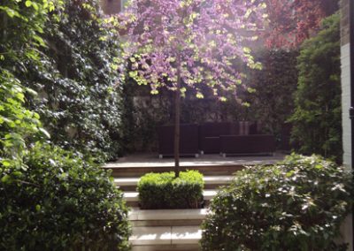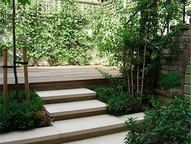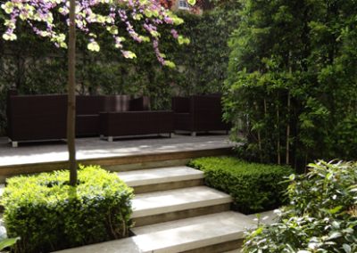 A small rear garden in Chelsea, London sw10: in conjunction with extensive renovations to the house, I was asked to design a new garden on two levels connected by a generous flight of steps. The colour scheme was green and white and the style minimalist. I used Portland limestone on the lower level and steps, and iroko decking on the higher level to emphasise the difference. The planting was mostly loose-clipped box and star jasmine on the walls and trellis.